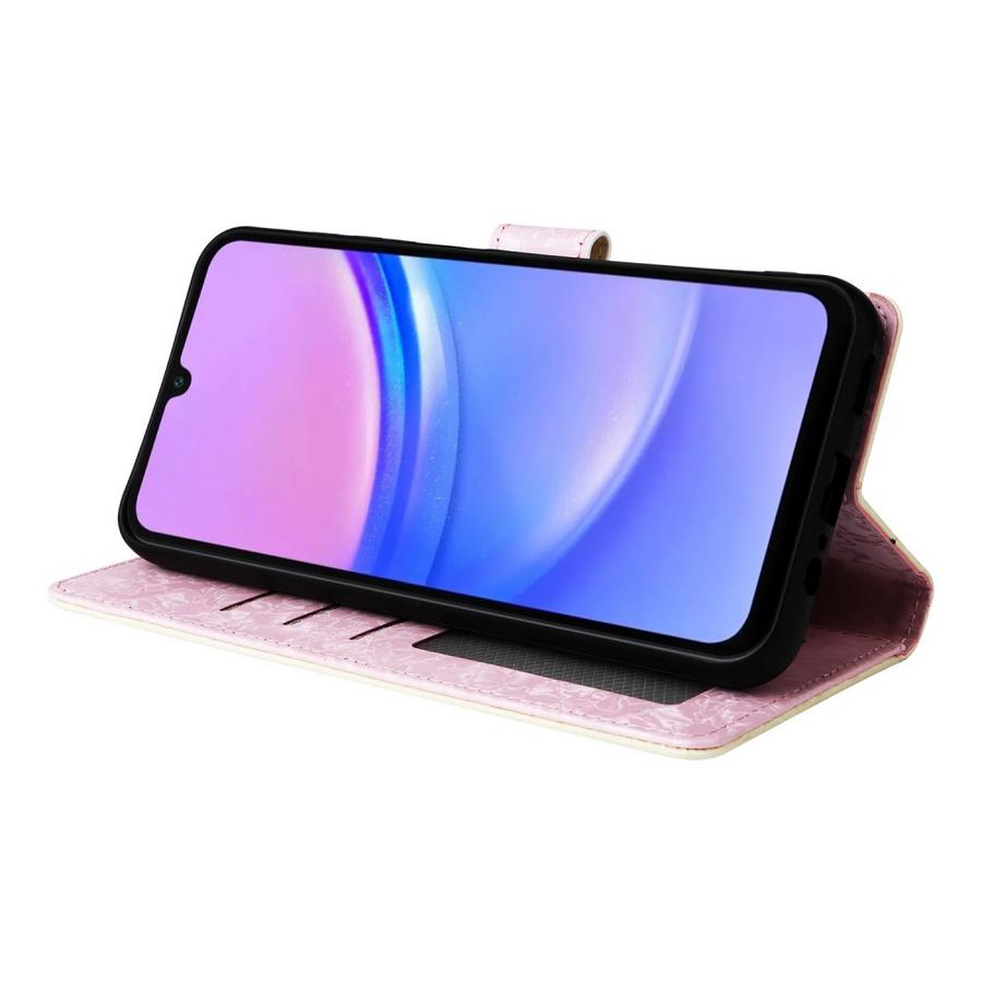 Hempeät vaaleanpunaiset kannet suojaavat tehokkaasti Samsung Galaxy A16 -älypuhelinta osumilta lompakkomallisessa kotelossa.