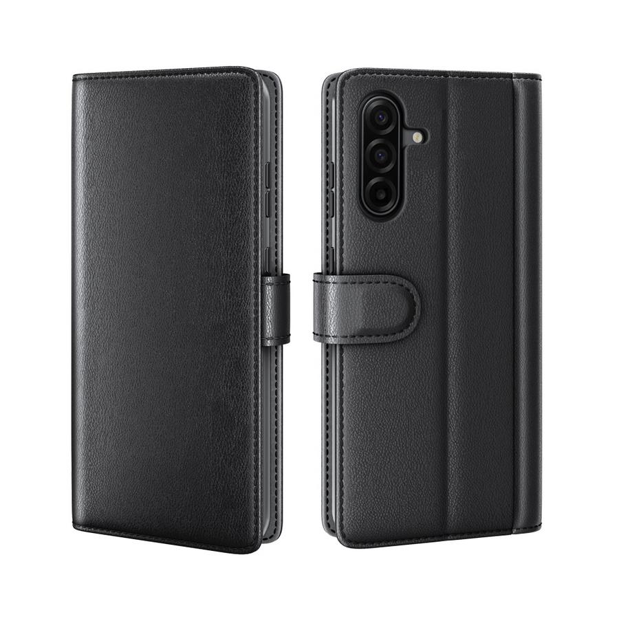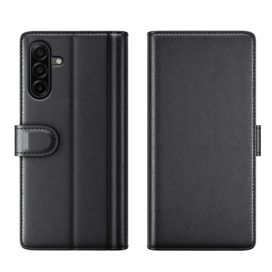 Klassisen mallinen nahkakotelo mustalla värityksellä suojaa erinomaisesti Samsung Galaxy A17 -älypuhelimen rikkoutumiselta.