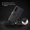 Tyylikkäästi mustakantinen lompakkokotelo suojaa Samsung Galaxy A17 -älypuhelimen osumilta ja putoamisten tuottamilta vahingoilta.