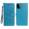 Kauniin petrolinsävyinen sininen suojakotelo Samsung Galaxy A22 5G puhelinta varten on somistettu painetuin kukin ja perhosin.