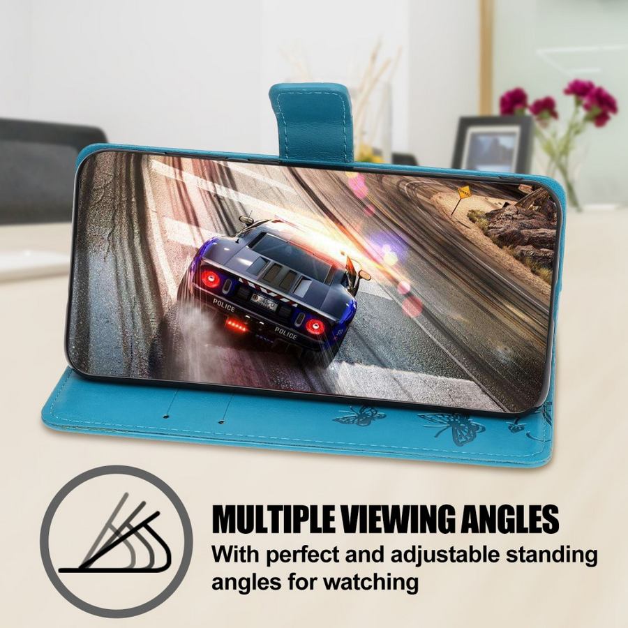 Ihastuttavan soma vaaleanpunainen, perhos- ja kukkakuvioitu lompakkokotelo, joka turvaa Samsung Galaxy A22 5G puhelimen särkymiseltä.