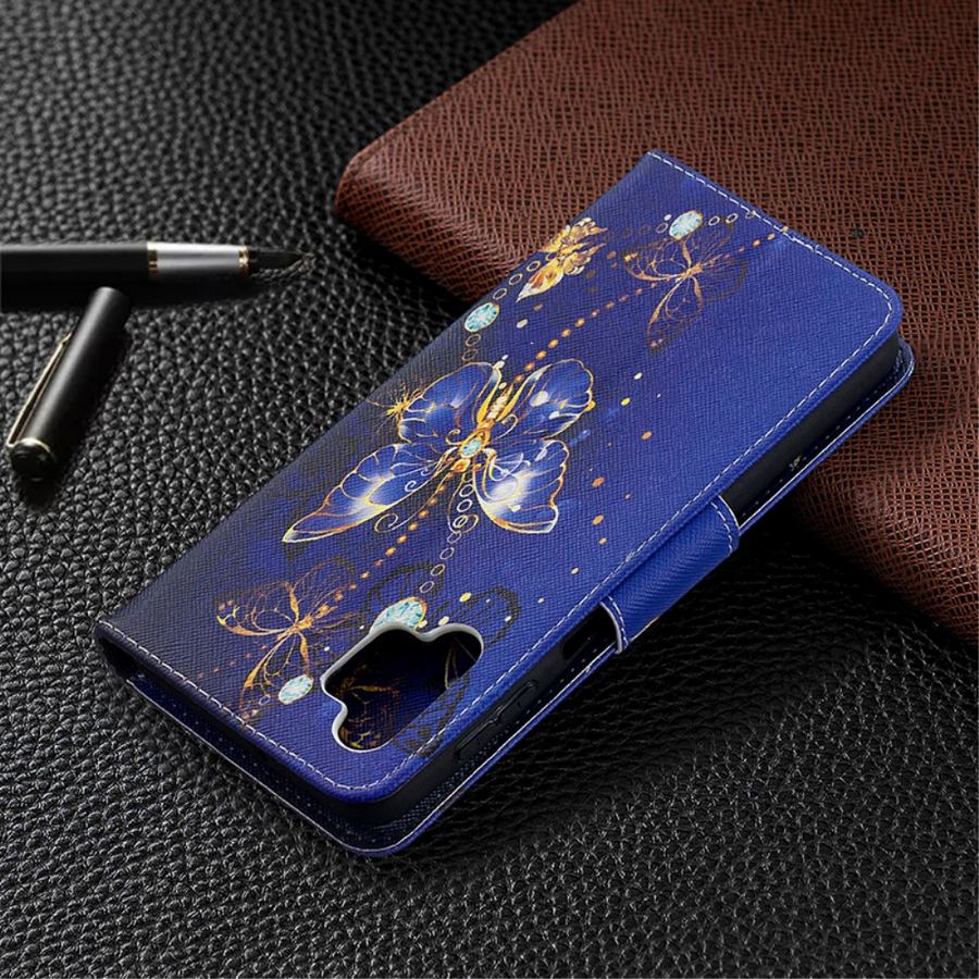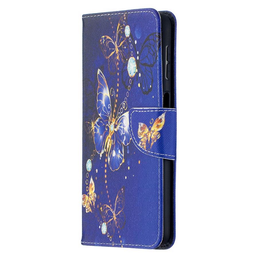 Upeat tummansiniset kannet on kuvioitu perhosilla ja korukivillä, kaunis ja hyvin suojaava kotelo Samsung Galaxy A32 5G puhelimelle.