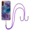 Vaaleaa ja violettia pintaa kauniisti marmorikuvioituna kotelossa, jolla suojaat Samsung Galaxy A34 5G puhelimen rikkoutumiselta.