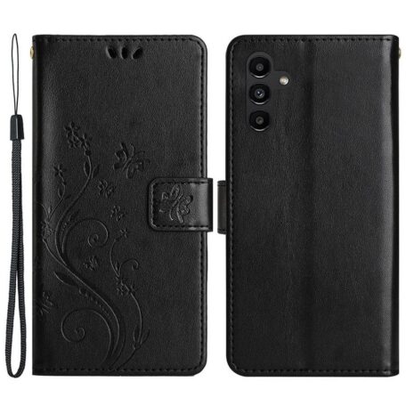 Tyylikkäästi painokuvioiduin perhosin ja kukkasin somistetun mustan kotelon suojassa Samsung Galaxy A35 5G puhelinta on turvallista käyttää.