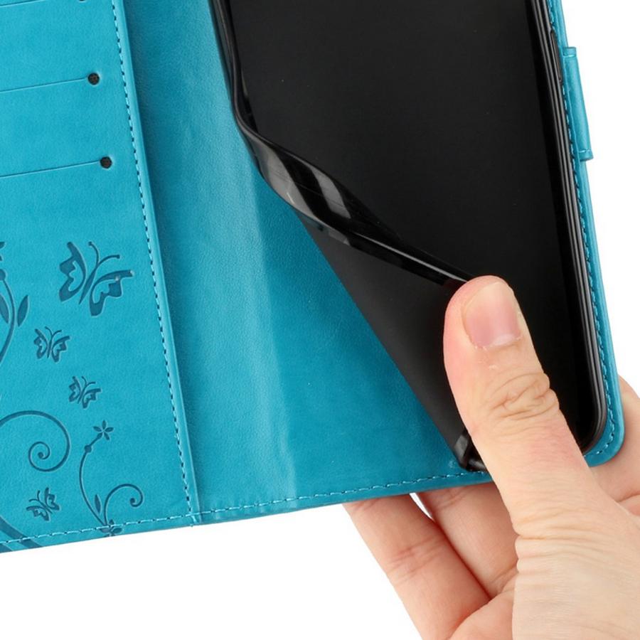 Perhosia ja kukkia painettuina petrolinsävyiseen siniseen koteloon, jolla suojaat Samsung Galaxy A36 5G puhelimen kauttaaltaan.