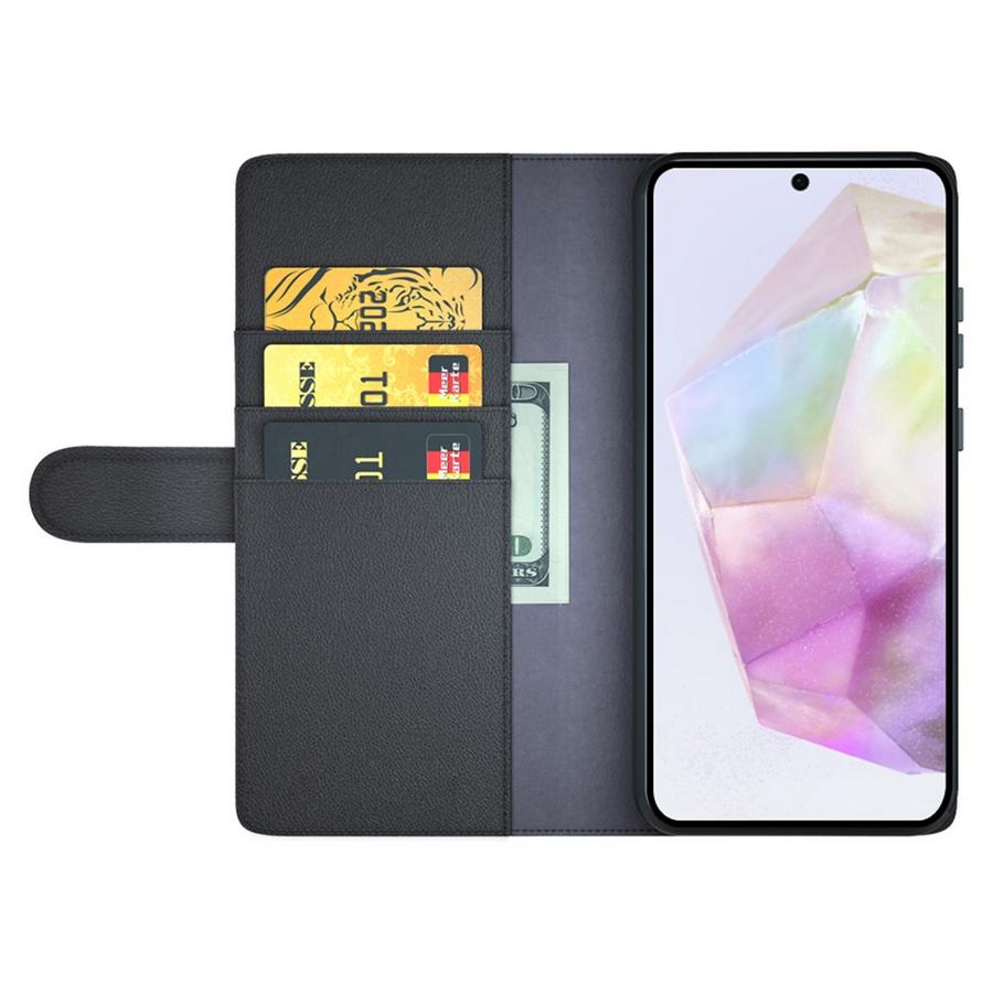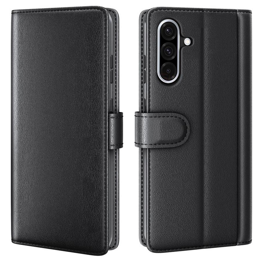 Tyylikäs nahkakotelo mustan värisin kansin on erinomainen suoja vahinkojen välttämiseen Samsung Galaxy A36 5G puhelimelle.