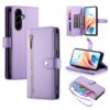 Heleän vaaleasävyisen violetissa lompakossa on hyvä suojaus Samsung Galaxy A37 5G -puhelimelle ja paljon tilaa maksuvälineille.