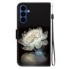Samsung Galaxy A37 5G puhelimen suojaksi näyttävä kotelomalli, jonka mustapohjaisissa kansissa on upea suuri kukkakuvio.