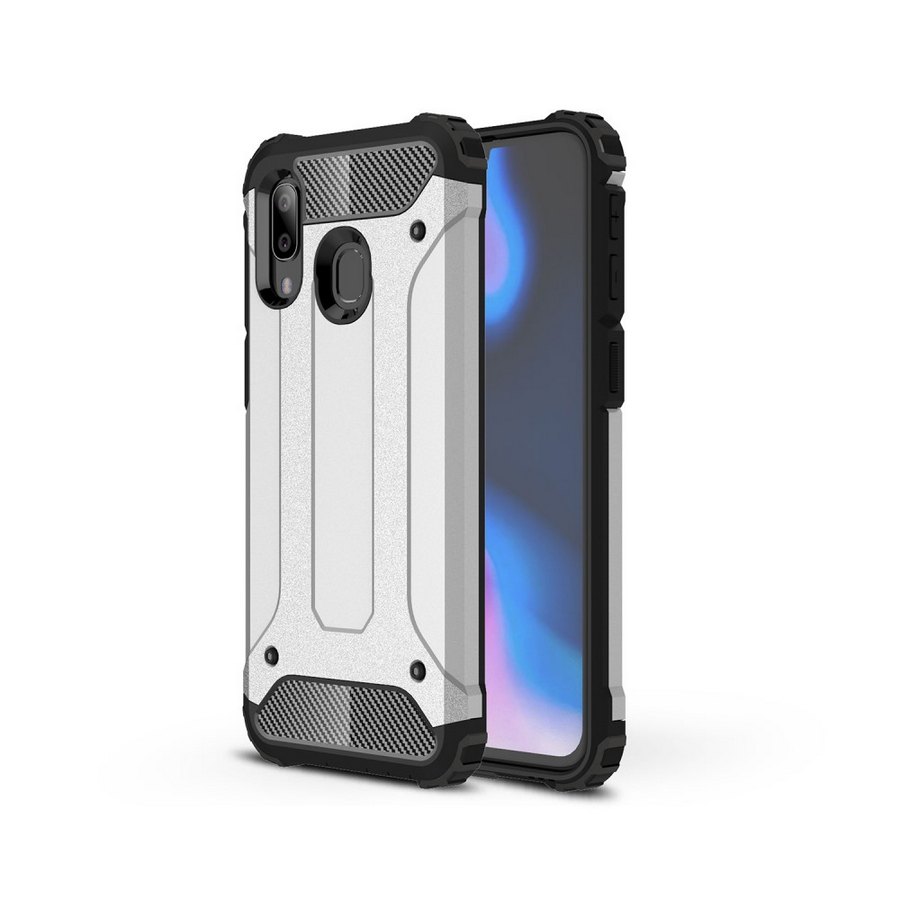 Tilaa tukeva, kestävä ja hyvin suojaava 2-osainen hopean värinen suojakuori suojaamaan Samsung Galaxy A40 älypuhelinta putoamisilta ja iskuilta.