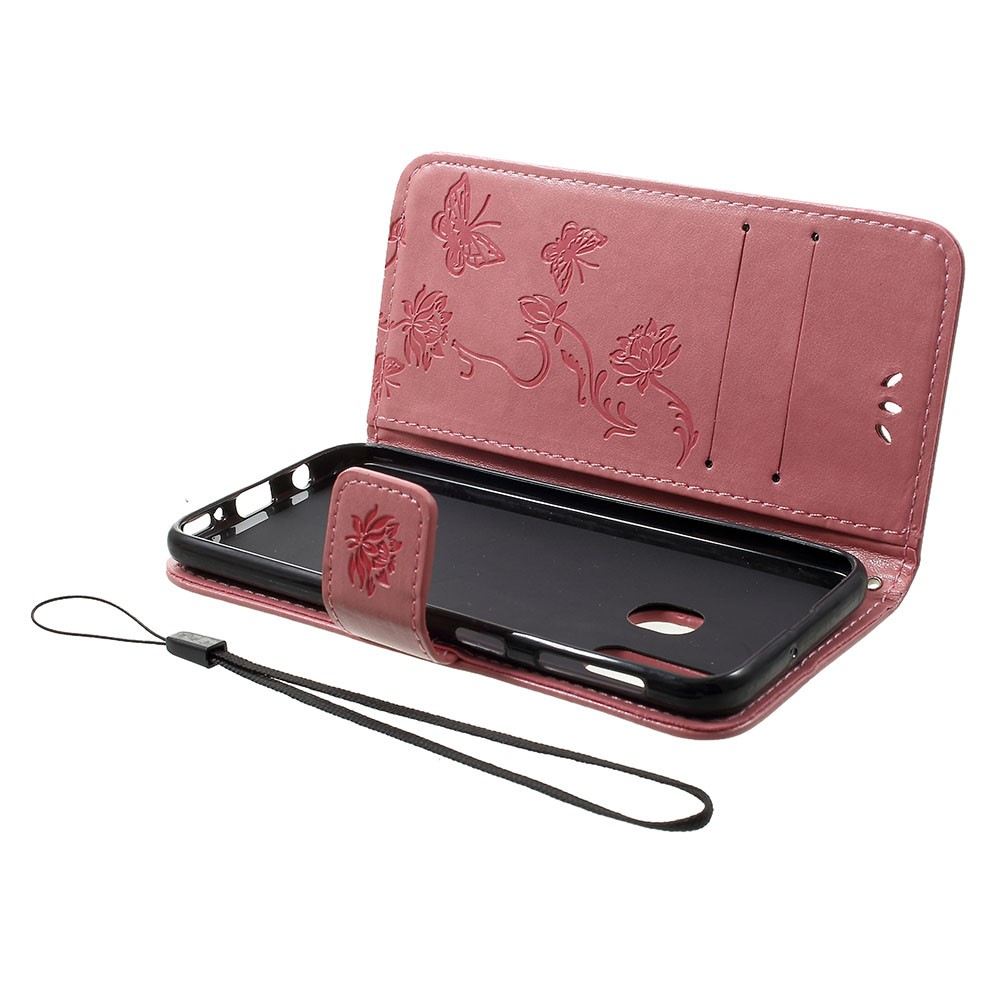Meiltä tilaat edullisesti ja nopealla toimituksella Samsung Galaxy A40 älypuhelimeen sopivan vaaleanpunaisen suojakotelon, jossa on kukkia ja perhosia.