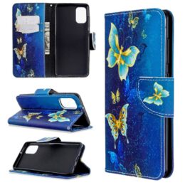 Tilaa Samsung Galaxy A41 puhelimen suojaamista varten kotelo, jonka pinnassa viehkeäsiipiset perhoset lentävät sinistä taustaa vasten.