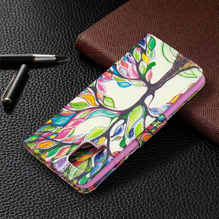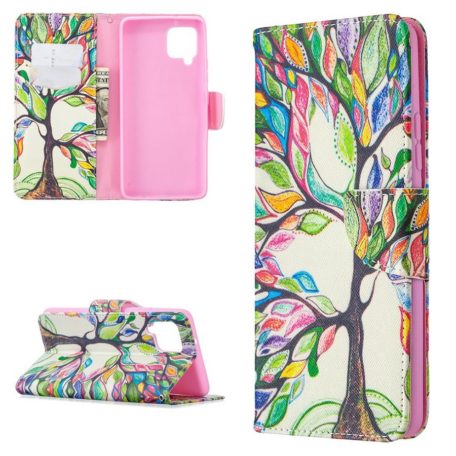 Sateenkaaren värisiä lehtiä kasvava puu somistaa Samsung Galaxy A42 5G älypuhelimelle soveltuvaa pirteää ja turvallista suojakoteloa.