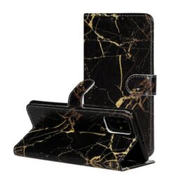Kansikuvioinnissa mustaa pintaa halkovat kullansävyyn taittavat marmoroinnit. Kaunis ja suojaava kotelo Samsung Galaxy A51 puhelimelle.