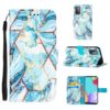 Raikkailla sinisen sävyillä marmorikuvioitu lompakkokotelo, joka suojaa Samsung Galaxy A52 / A52 5G malleja särkymiseltä ja naarmuilta.