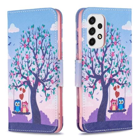 Hellyttävän suloinen kotelomalli suojaamaan Samsung Galaxy A53 5G puhelinta, kuviona kukkivan puun katveessa keinuva pöllöpariskunta.