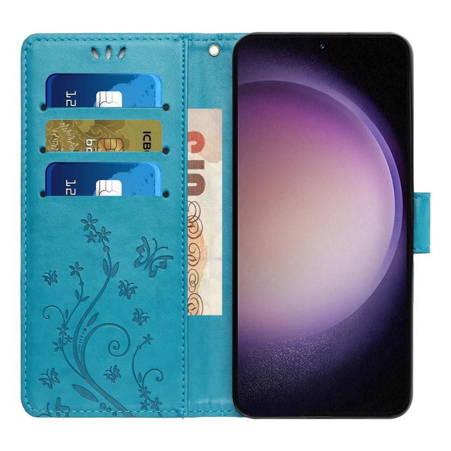 Perhosia ja kukkia painettuina petrolinsävyiseen siniseen koteloon, jolla suojaat Samsung Galaxy A56 5G puhelimen kauttaaltaan.