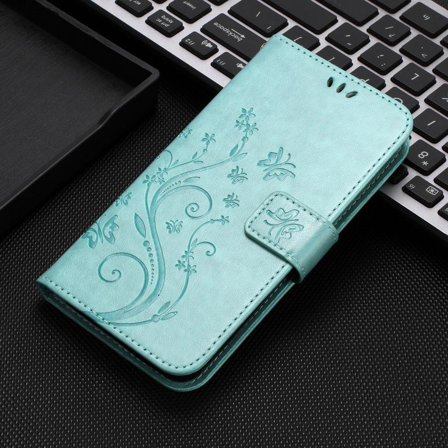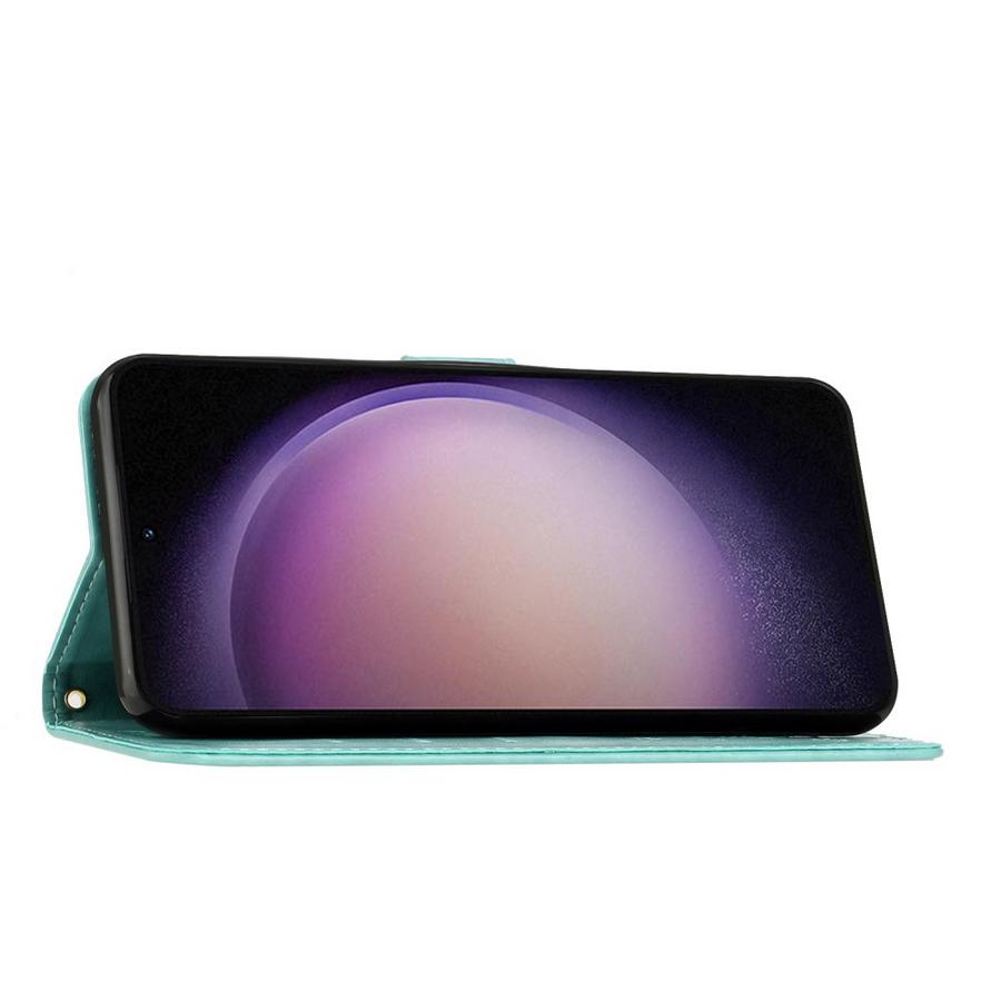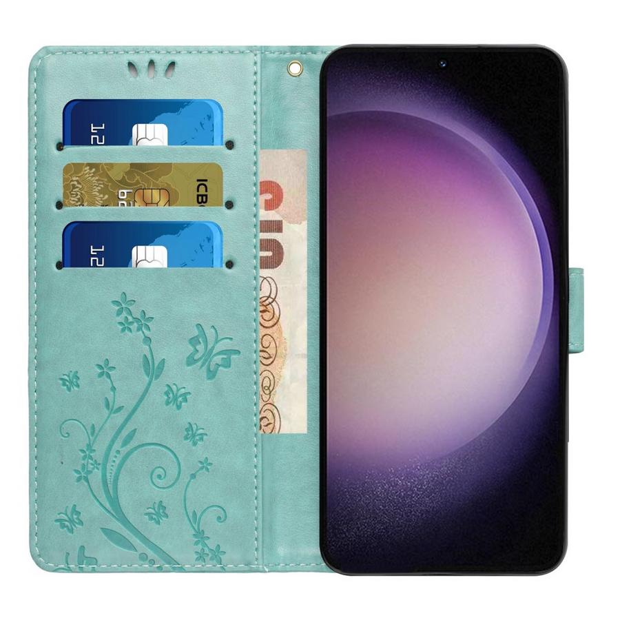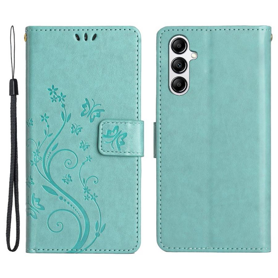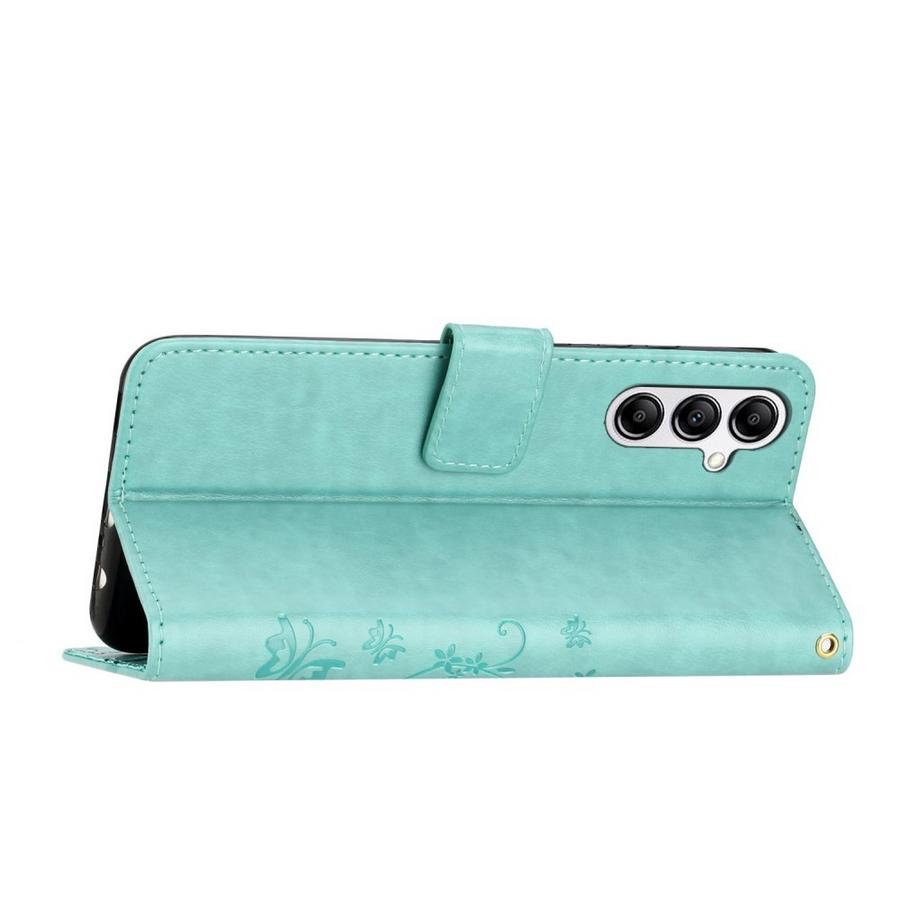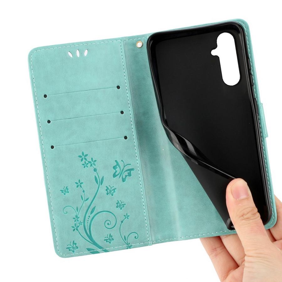 Pirteät turkoosin väriset kannet on kuvioitu suloisilla perhosilla ja kukilla, suojakotelo Samsung Galaxy A56 5G puhelimen turvaksi.