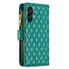 Samsung Galaxy A56 5G puhelimelle erinomaisen suojauksen sisältävä lompakko, jonka ihastuttavan vihreissä kansissa on kaunis vinoruudutettu kuviointi.
