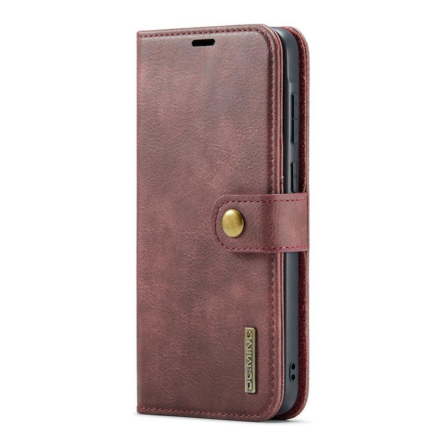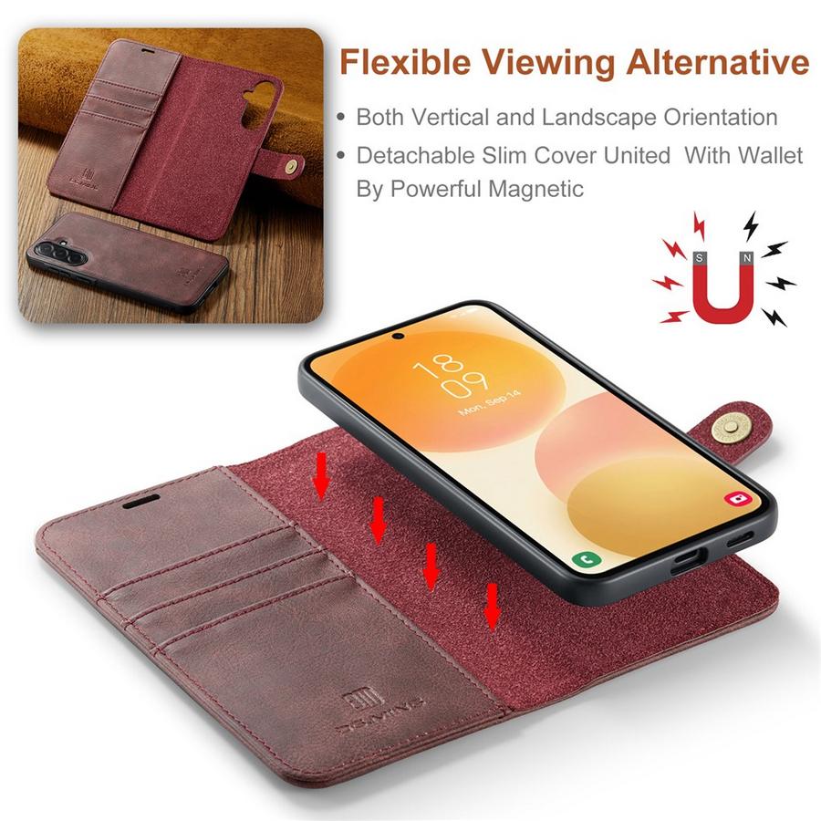 Kauniin viininpunainen kotelo on Samsung Galaxy A57 5G puhelimen luja suoja, jossa yhdistyvät takakuoren ja lompakkomallin parhaat puolet.