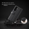 Lompakkomallinen kotelo pysyy kiinni magneettisella läpällä ja ympäröi puhelimen kauttaaltaan.
