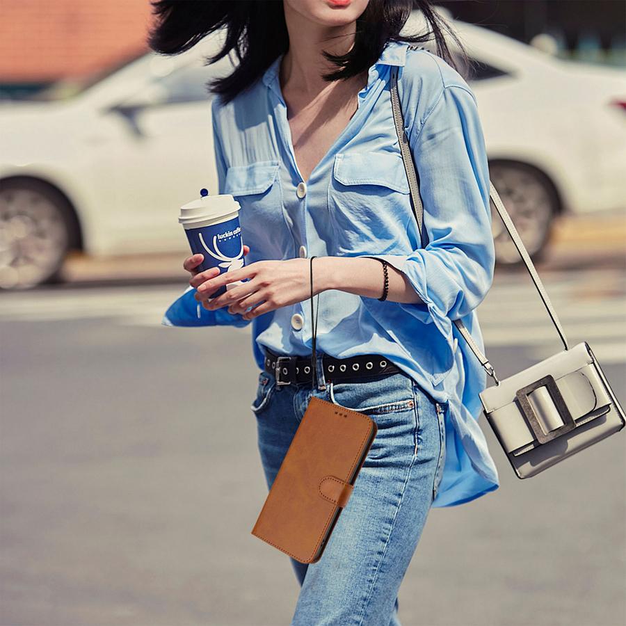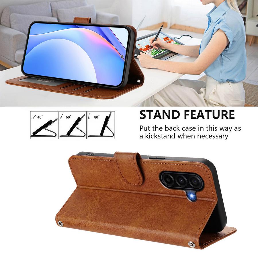 Pehmeään ruskeaan sävyyn puettu lompakkokotelo Samsung Galaxy A57 5G -älypuhelimen suojaamiseen kolahduksilta ja pintojen naarmuilta.