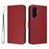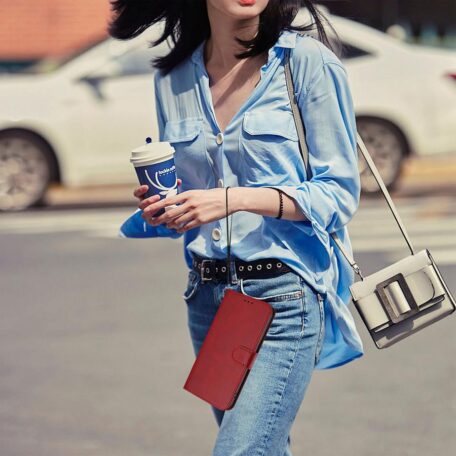 Puhelimelle ja maksuvälineille kauttaaltaan peittävä suojaus elegantin viininpunaisella kotelolla, joka sopii Samsung Galaxy A57 5G -mallille.