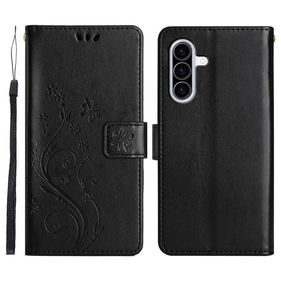 Kukkaköynnöksellä ja perhosilla kuvioitu elegantin musta kotelo on kattava vahingoittumisen suoja Samsung Galaxy A57 5G puhelinmallille.