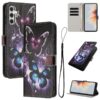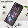 Samsung Galaxy A57 5G puhelimen suojaava lompakkokotelo, jonka tummissa kansissa on upeat ja kauniin väriset perhoskuvioinnit.
