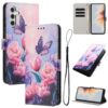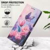 Suloinen tulppaanien ja perhosten kuvioima kotelomalli suojaamaan Samsung Galaxy A57 5G puhelinta osumilta ja naarmuuntumiselta.