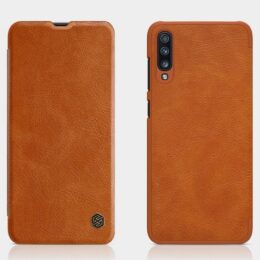 Meiltä suomalaisesta Puhelimenkuoret.fi verkkokaupasta tilaat nopealla toimituksella ruskean Nillkin Qin kotelon Samsung Galaxy A70 puhelimelle.