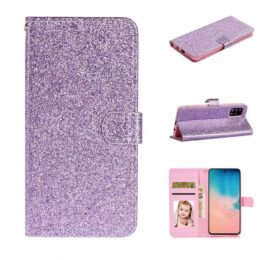 Puhelimen kuoret kuin discopallo! Veikeän violettina kimaltava lompakkokotelo myös suojaa Samsung Galaxy A71 puhelimen ei-toivotuilta kolhuilta.