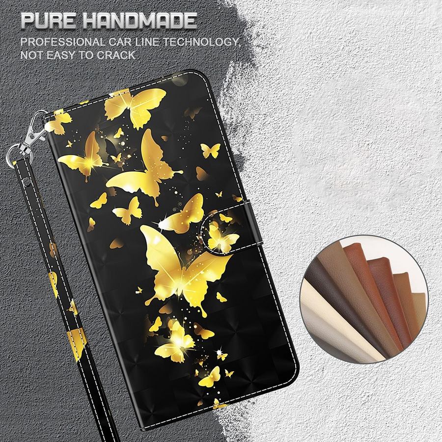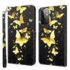 Kaunis kullankeltainen perhosparvi erottuu upeana tummaa pohjaa vasten ja Samsung Galaxy A72 puhelin on oivallisesti suojattu tässä kotelossa.