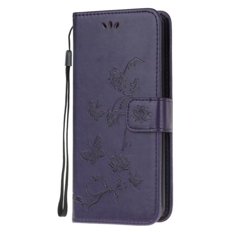 Upea tummanvioletti värisävy ja kauniisti painettuja kukkasia sekä perhosia kotelossa, joka suojaa Samsung Galaxy A72 puhelinta rikkoutumiselta.