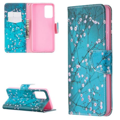 Herkillä kukkivilla oksilla somistettu turkoosinsininen kotelo, jossa Samsung Galaxy A72 puhelin on suojattuna ikäviltä vahingoilta.