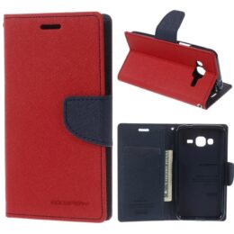 Suojaa Samsung Galaxy J3 (2016) älypuhelin iskuilta ja kolhuilta punaisella Goospery Fancy Diary suojakotelolla, jossa on sininen sisäosa.