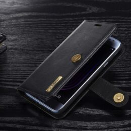 Mustalla DG.MING nahkakotelolla suojaat Samsung Galaxy J3 (2017) älypuhelimen ja siinä säilytät kätevästi kortit ja kuitit.