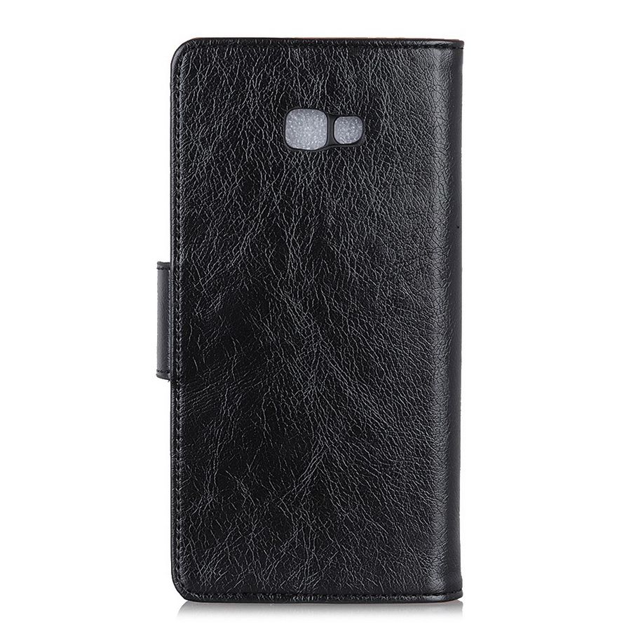 Mustassa nahkakotelossa säilytät setelit, kuitit ja kortit ja sillä suojaat Samsung Galaxy J4+ (2018) älypuhelimen iskuilta, putoamisilta ja naarmuilta.