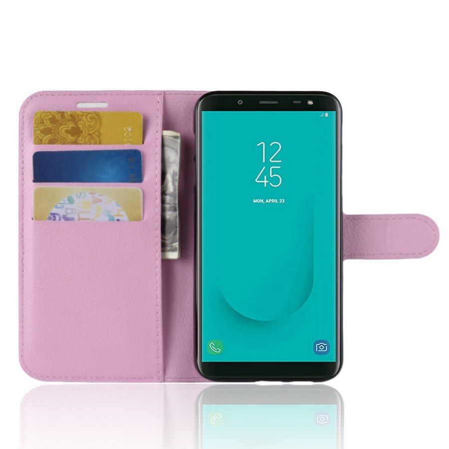 Meiltä puhelimenkuoret.fi verkkokaupasta tilaat edullisesti ja nopealla toimituksella vaaleanpunaisen lompakkokotelon Samsung Galaxy J6 (2018) puhelimelle.