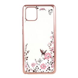 Keveä takakuori Samsung Galaxy S10 Lite puhelimeen, jonka kuviointi ja reunukset kiiltävää ruusukullan väriä pinkein kukkasin.