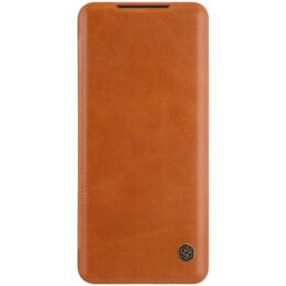 Tyylikäs ja laadukas ruskea Nillkin Qin suojakotelo auttaa suojaamaan Samsung Galaxy S20 5G puhelinta kolhuilta ja putoamisilta.
