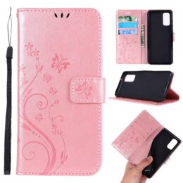Samsung Galaxy S20 5G älypuhelimeen sopivassa ruusukullan värisessä kukka suojakotelossa säilytät kätevästi kortit, setelit ja kuitit.