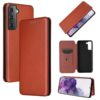 Tiilensävyisen ruskean kotelon suojassa Samsung Galaxy S21 5G -puhelin kulkee turvallisesti ja särkymättä mukana matkassa.
