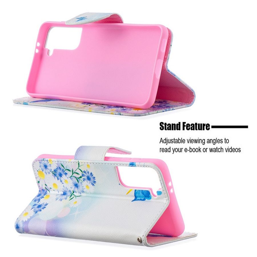 Herkän kauniin ulkoasun luovat niityn kukkaset ja perhoset vaaleissa sävyissä, kotelo joka turvaa Samsung Galaxy S21 5G puhelimen arjen vahingoilta.