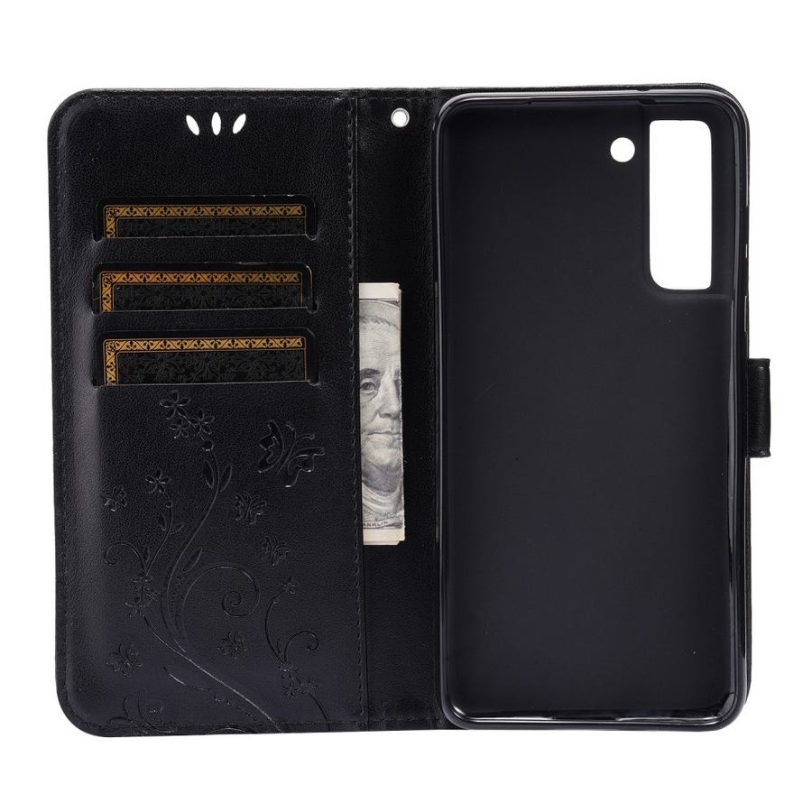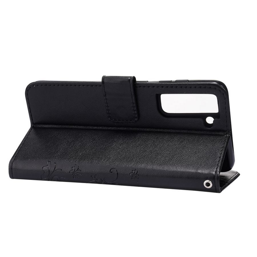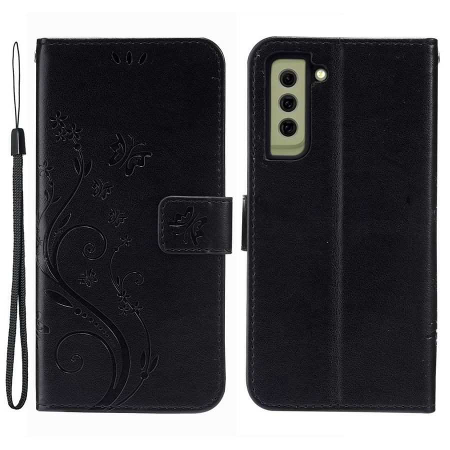 Elegantisti painokuvioitu ja ajattoman kaunis musta lompakkokotelo suojaksi Samsung Galaxy S21 FE 5G älypuhelimelle.