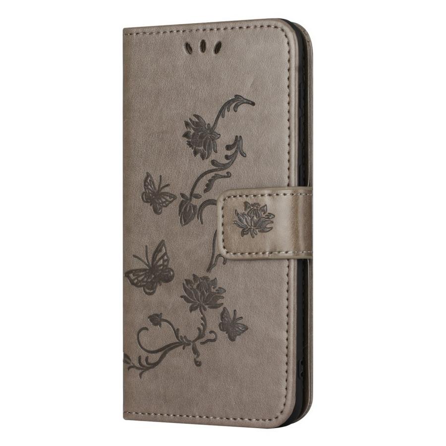 Hillityn harmaan kotelon somistus on tehty tyylikkäästi painetuin kukin ja perhosin, Samsung Galaxy S24 5G puhelimelle sopiva suoja.