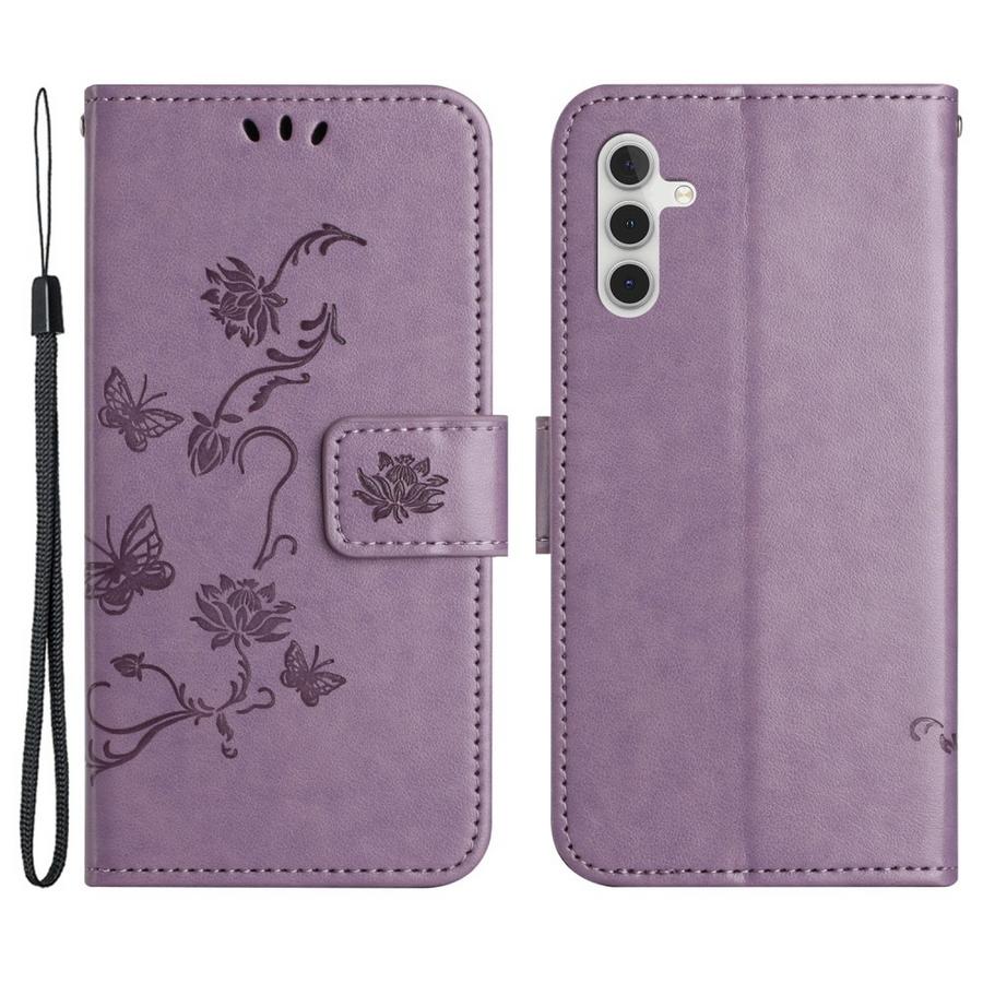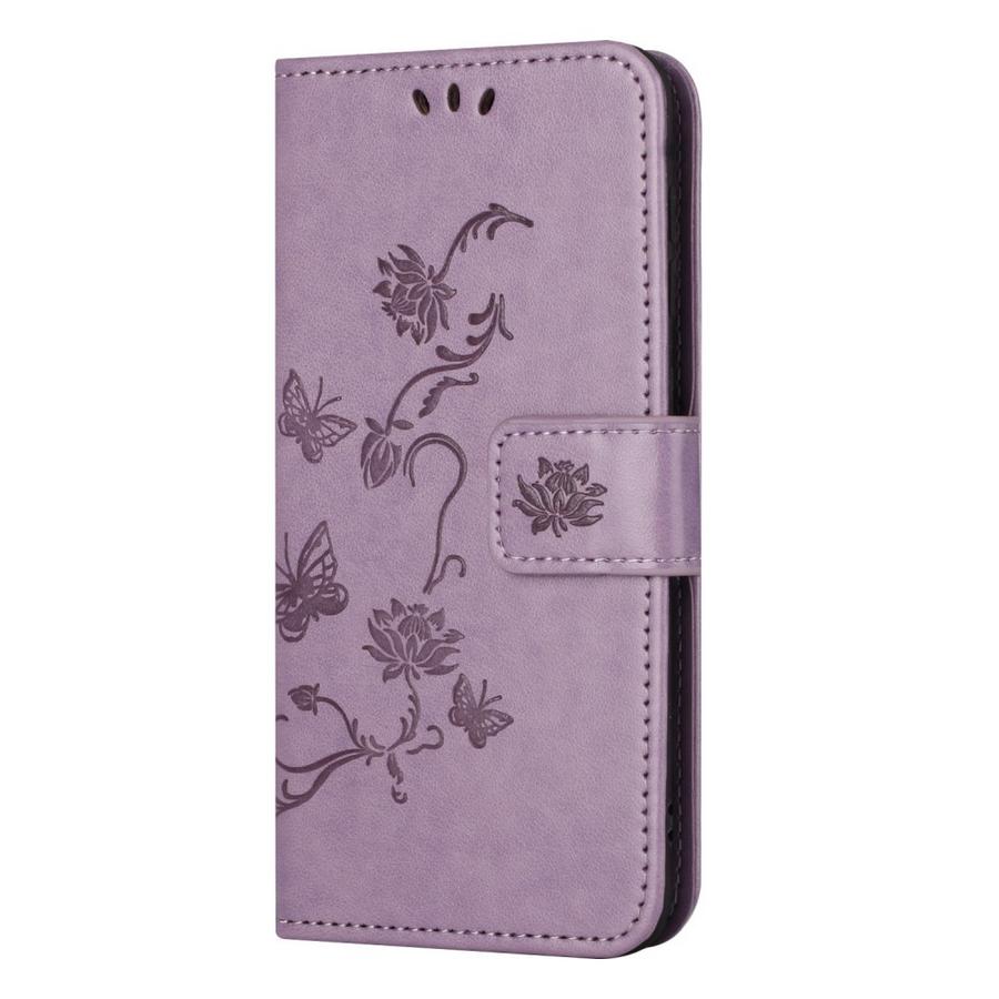 Hempeä vaalenvioletti kotelo, jonka somistuksena on painettuja kukkia ja perhosia. Pätevä ja napakka suoja Samsung Galaxy S24 5G puhelimelle.
