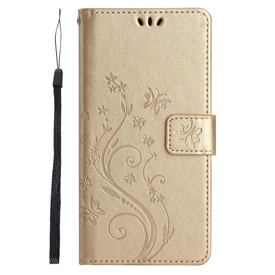 Viehättävä kukin ja perhosin kuvioitu lompakkokotelo on tehokas suoja osumilta ja puhelimen naarmuuntumiselta.