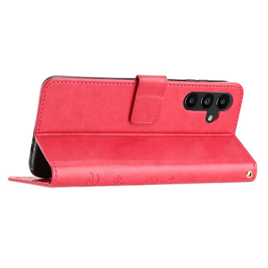 Samsung Galaxy S24 FE 5G -älypuhelimen suoja, jossa on ihanat pinkit kannet somistettuna kauniisti painetuilla köynnös- ja perhoskuvioilla.