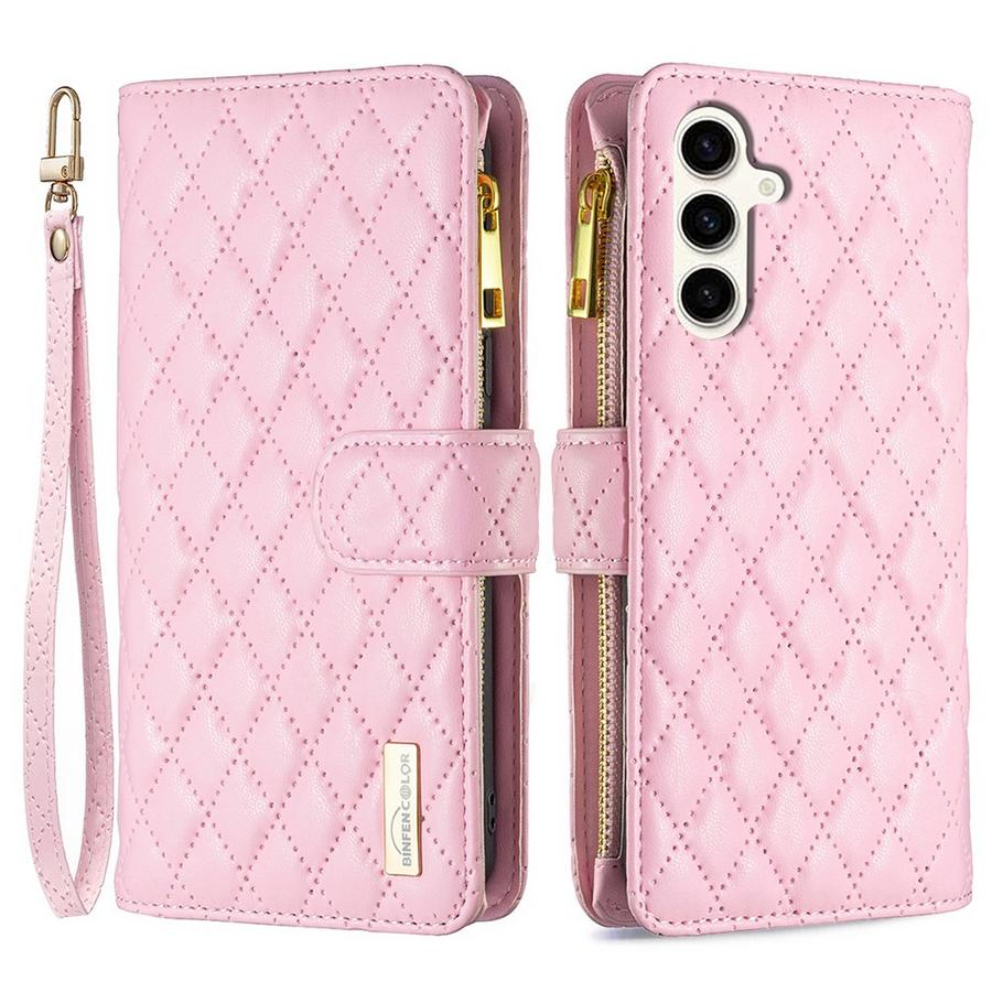 Suloisen vaaleanpunaisen värinen lompakko kauniilla ruutukuvioinnilla, sisältää erinomaisen suojan Samsung Galaxy S24 FE 5G puhelimelle.