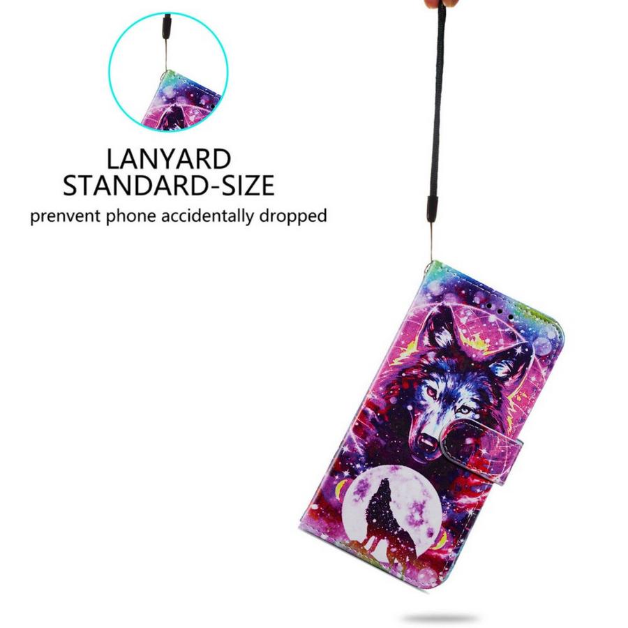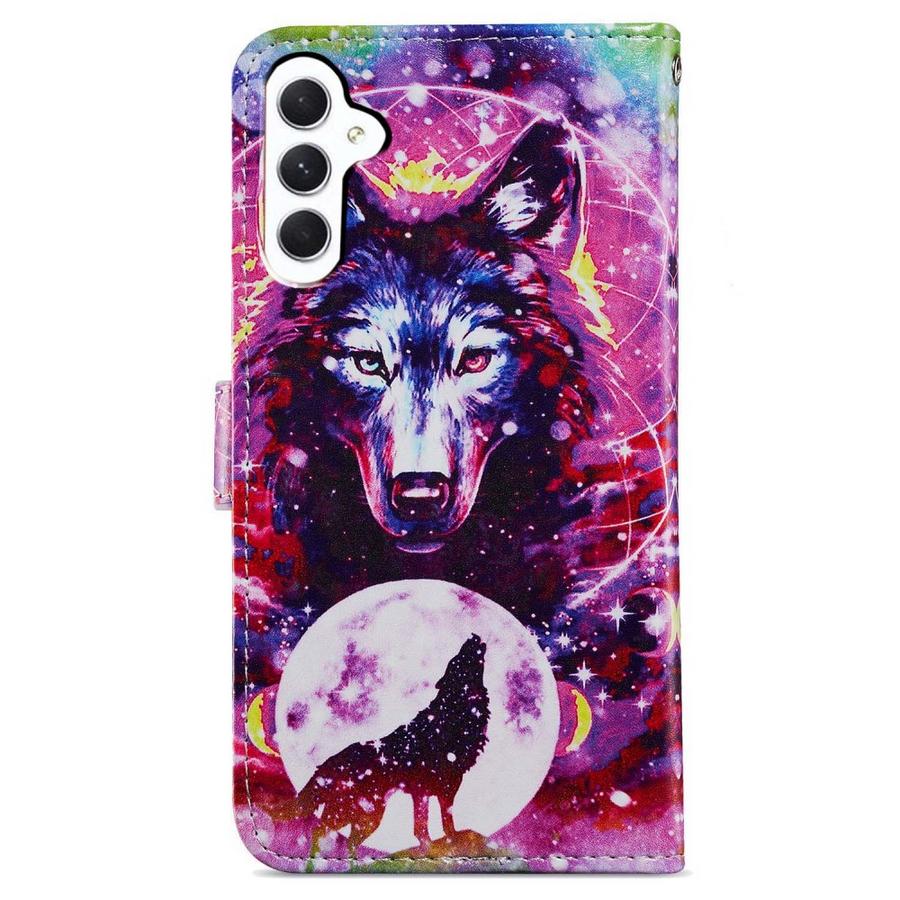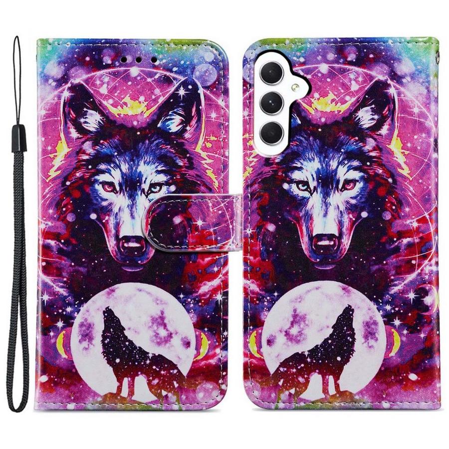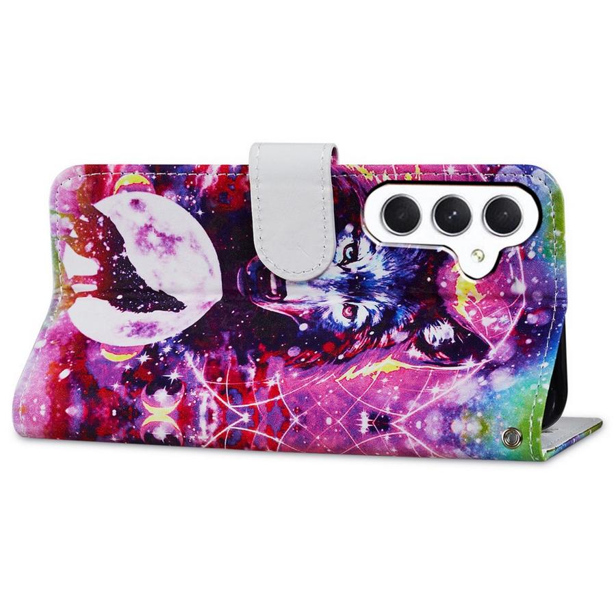 Upeissa väreissä susihahmojen kuvioima lompakkomallin suojakotelo, joka pitää Samsung Galaxy S24 FE 5G puhelimen turvattuna osumilta.
